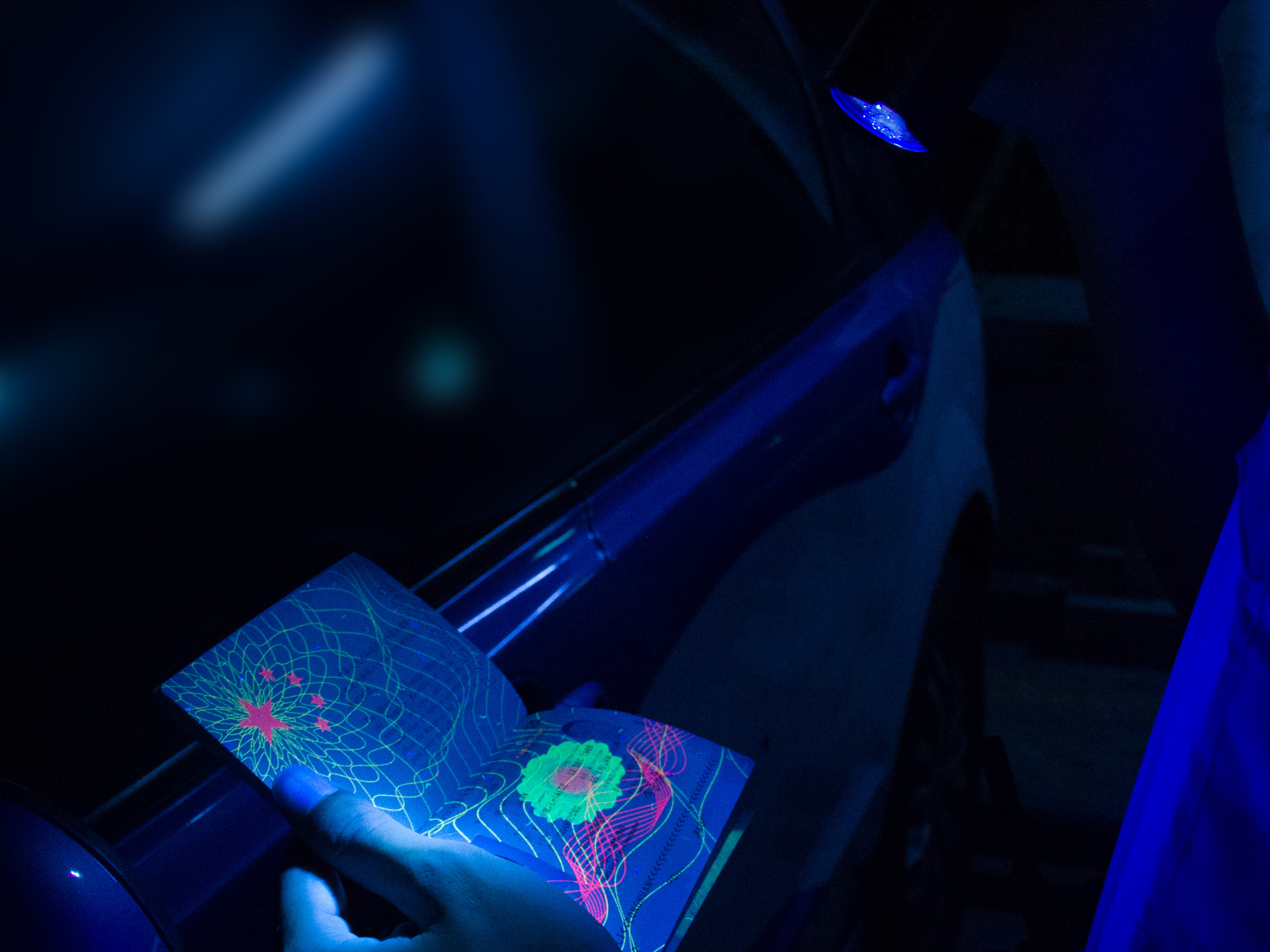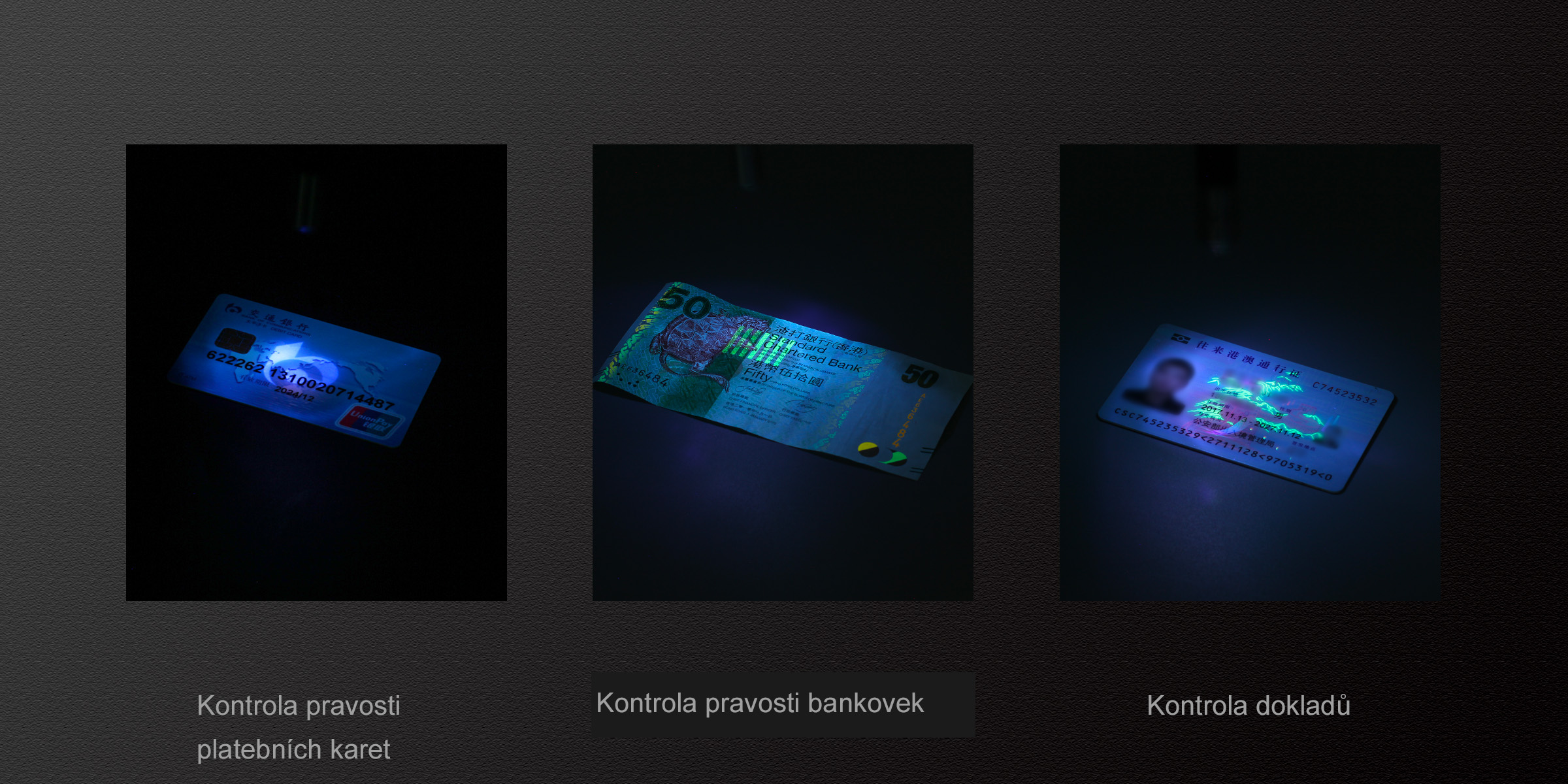 - Ověřování pravosti: Bankovky, doklady, platební karty a jiné cennosti mají ochranné prvky viditelné zejména pod UV světlem.